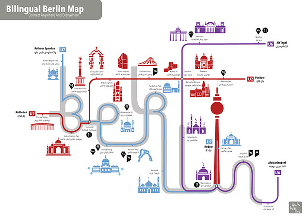 The Berlin Bilingual Map is designed for the three main-lines of the Berlin underground, in order to help people whom speak Arabic to reach different places easily. The map meets the refugees that have came to Berlin and unable to communicate and reach their needs.
